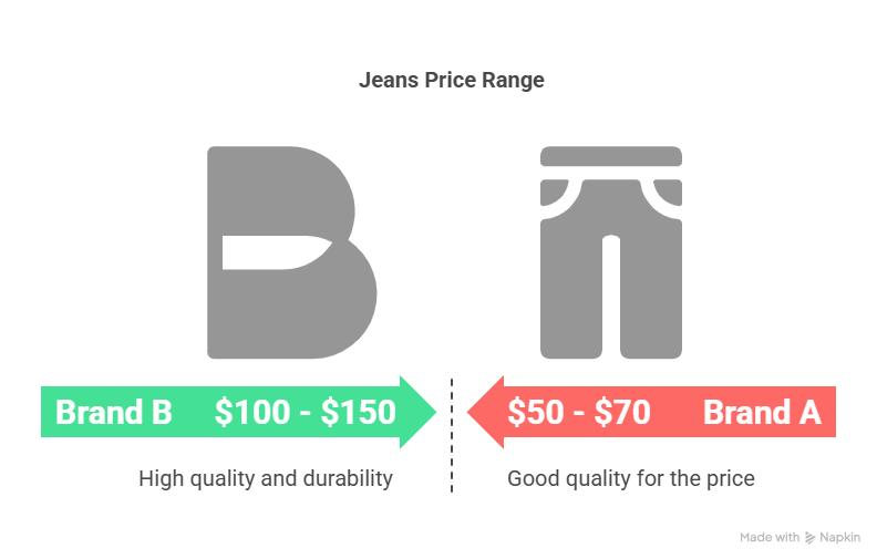 Buying jeans can be like a treasure hunt! Different brands offer jeans at various prices. Some are like friendly go-to jeans, while others might break your piggy bank. But is it worth it? Let’s compare: Brand A prices jeans at $50—$70. Brand B charges about $100—$150 for jeans that seem made of magic fabric.