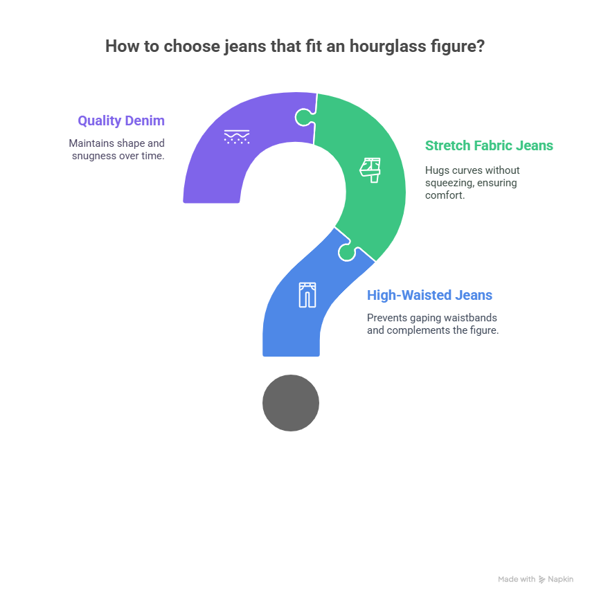 To choose denim for an hourglass figure, look for jeans that fit well at the waist. Search for stretchy fabric so it hugs your shape comfortably. High-waisted jeans can show off your curves nicely. Avoid loose or very tight jeans, they might not fit as well.