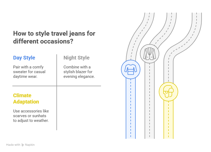 Travel jeans can fit any occasion with the right mix and match. For a day-to-night style, pair your jeans with a comfy sweater during the day. At night, swap for a stylish blazer. Use smart accessories to adapt to climates and settings. Add a scarf in chilly areas or a sunhat in sunny spots.