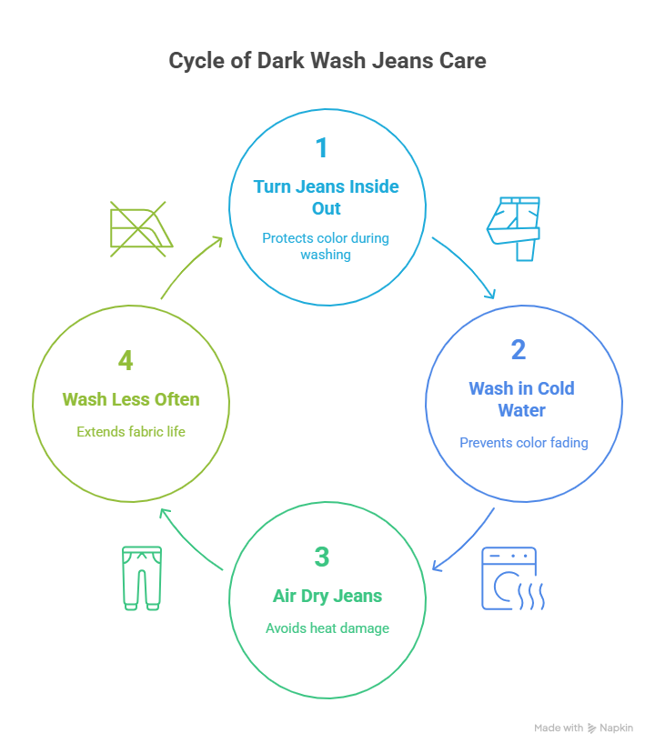 To keep your dark wash jeans nice, wash them inside out. Use cold water and mild soap for washing. Hang them to dry in the shade instead of using a dryer. Don’t wash them too often to help keep their color.