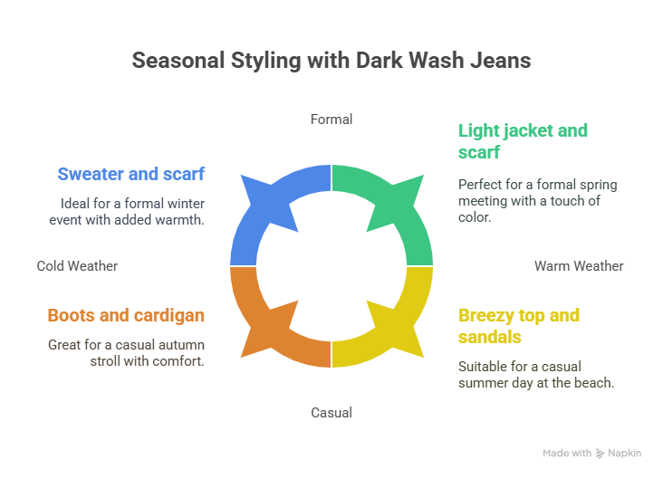 As seasons change, so does the art of dressing. Imagine your dark wash jeans as a blank canvas. For chilly winter days, layer them with fluffy sweaters or cozy turtlenecks. But as blooms peek in spring, switch to a light jacket or a bright scarf. In autumn, pair them with boots and a snug cardigan. Can dark wash jeans work for all seasons? Absolutely! They’re your adaptable wardrobe heroes, challenging any weather with grace.