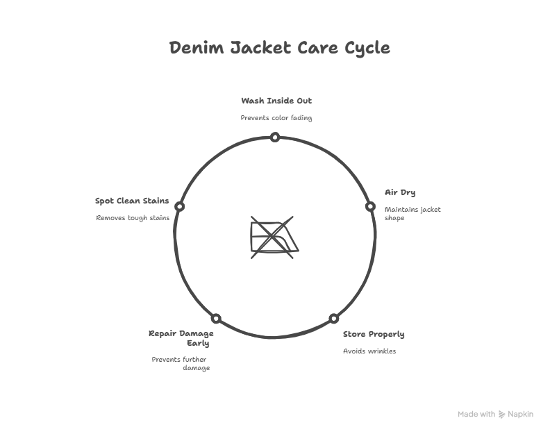 To keep your designer denim jacket looking great for a long time, treat it gently. Wash it in cold water and let it air dry. Fold it neatly or hang it up to avoid wrinkles. Keep it away from sharp things that could rip it. If it gets dirty, clean it right away.