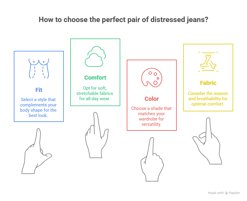 Finding the perfect pair of distressed jeans may feel like a treasure hunt. For different body types, the fit and comfort matter most. Slim fit might suit some, while others could prefer a relaxed style. Colors range from classic blues to bold blacks, adding flair to any outfit. Fabrics vary too; pick breathable material for comfort. What’s the secret to the perfect pair of jeans? Finding the right size and trying on different styles to see what feels best! Remember, it’s not just clothing, it’s a confidence booster.