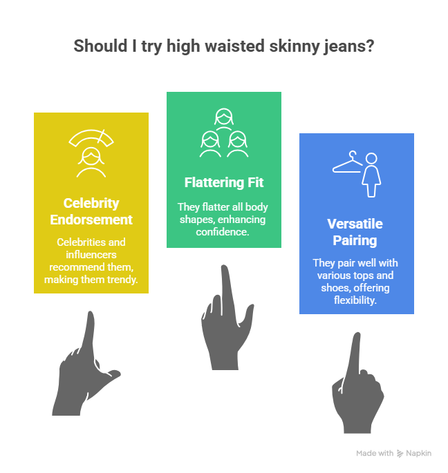 High waisted skinny jeans are a favorite in today’s fashion trends. Why? Celebrities and influencers adore them. These jeans flatter all body shapes and pair well with tops and shoes. Many stars like Selena Gomez and influencers share their love on social media. They even suggest mixing them with colorful tops for a pop! So, if you’re looking to upgrade your wardrobe, high waisted styles are a must-try.