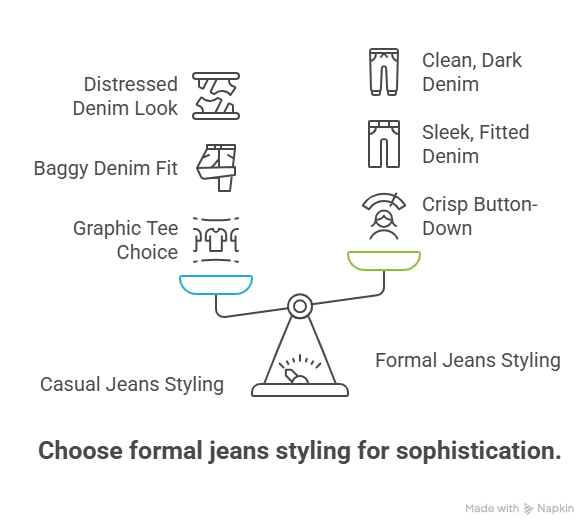 “Are jeans acceptable for formal occasions?” Well, they can be, if styled correctly! Stick to clean, dark denim and avoid flashy or worn-out looks. According to style experts, quality matters, too.
