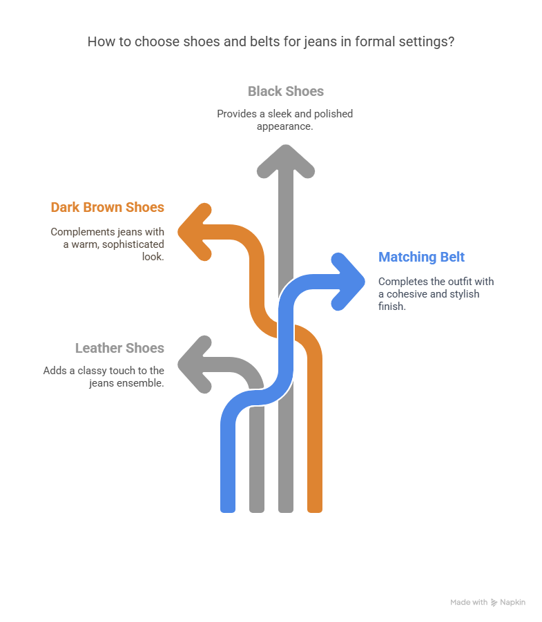 Choosing the right shoes with jeans for formal events can make a big difference. Pair your jeans with leather shoes to keep things classy. Dark brown or black shoes work best. Your belt should match your shoe color for a polished look. You can try a black leather belt for a sleek finish or a brown one for a warm touch. Remember, little things make your outfit look complete!