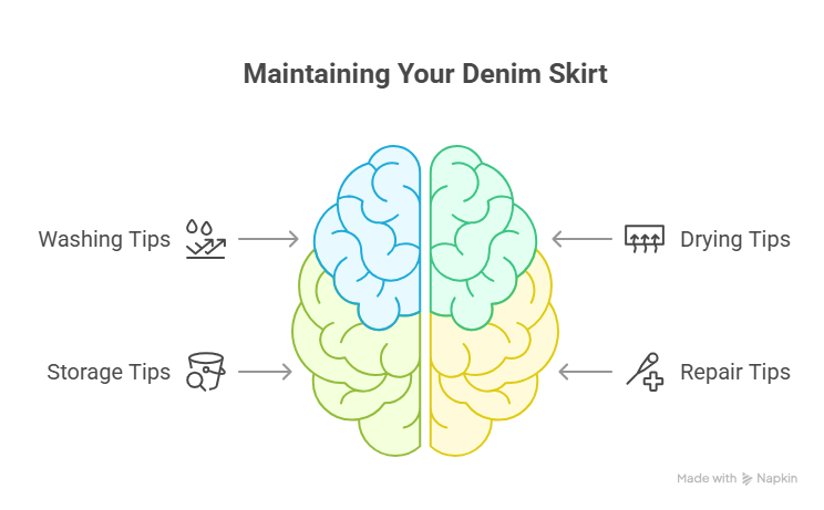 Washing and storage tips to maintain quality. Advice on dealing with fraying and tears. Denim skirts can stay stylish and last long if cared for properly. Wash them inside out in cold water and air dry to keep their color and shape.