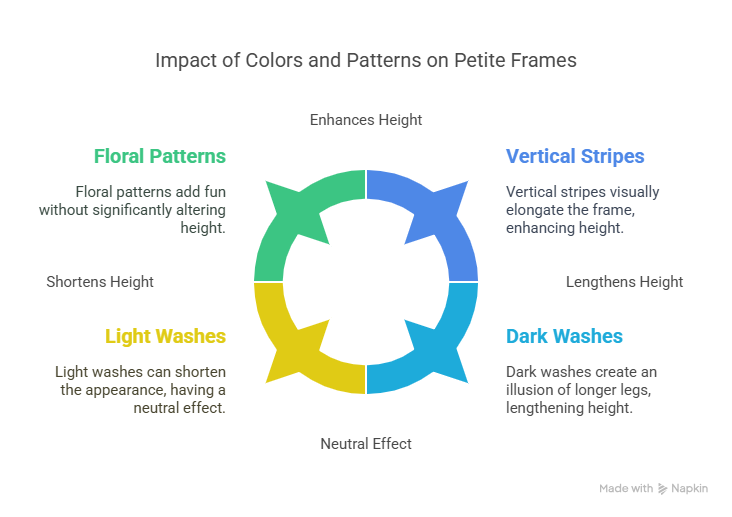 Choosing the right colors and patterns can work wonders for petite frames! Dark washes can make legs look longer, like a magic trick with fabric. Light washes are playful but might shorten the look a bit. Patterns can either boost height or play it down. Vertical stripes are a short girl’s best friends. They make anyone look taller! Floral patterns, in small doses, add fun without shrinking your height.