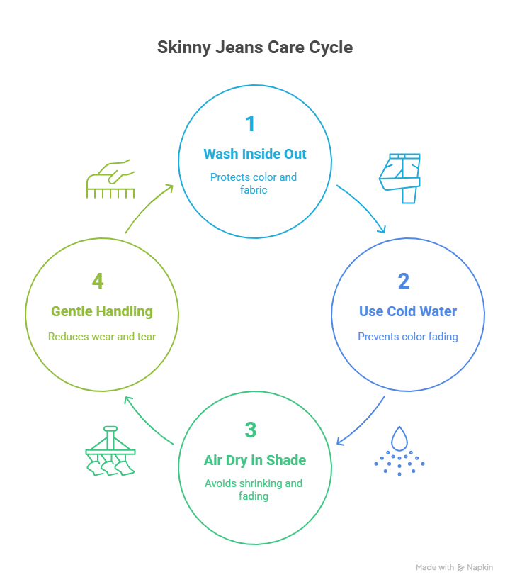 Taking care of your skinny jeans is easy and keeps them looking fresh. Wash them inside out with cold water. This keeps the color bright. Avoid machines when drying. Instead, let them air dry in the shade to reduce fading. This also keeps them from shrinking. Gentle handling prevents wear and tear.