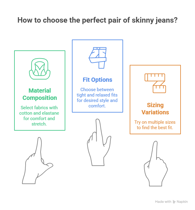 When picking skinny jeans with some stretch, it’s like finding the perfect dance partner. First, choose the right material. Fabrics like cotton with a touch of elastane or spandex offer comfort. Think of them as your comfy couch that makes your jeans stretchy enough for movement. Also, check the fit options. Some are tight in all the right places, and others give a bit more space around the legs. Sizing is also key. It can vary like choosing between lunch at home and lunch at a friend’s. Always try them on, if you can. Remember, the perfect pair can feel like they’ve been tailor-made just for you. Do skinny jeans fit all body types? Most can, depending on material and fit options. Finding the right match can boost your confidence and style.